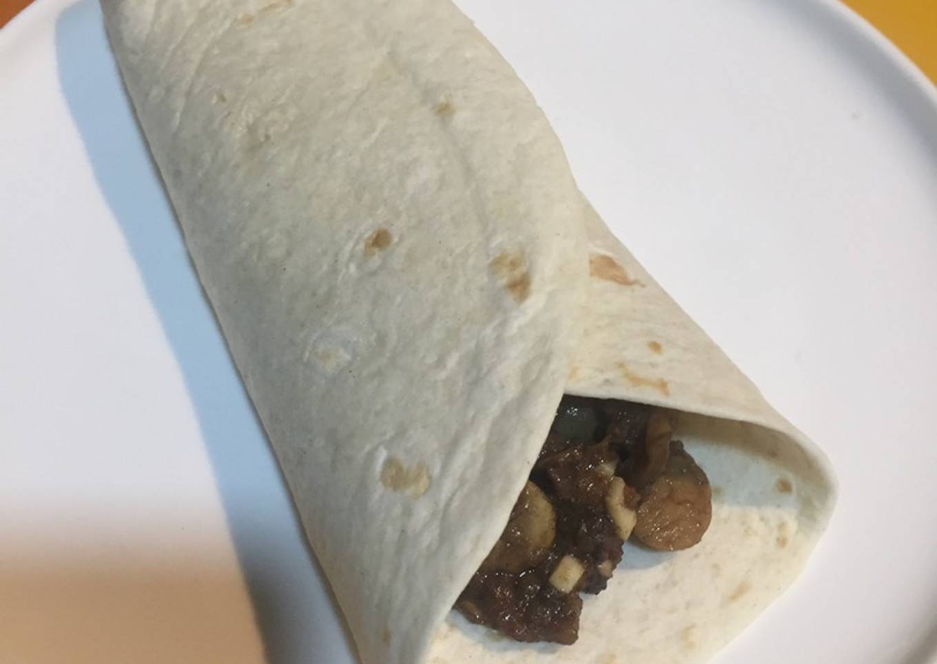 - Ahora vamos a hacer los tacos. En nuestro plato situamos una tortita que estará templada y en el centro ponemos, con una cuchara, parte el relleno que hemos cocinado, ocupando como un tercio de la superficie de la tortita y de manera vertical dejando un espacio arriba y abajo desde el filo de la masa. Doblamos la parte baja sobre el relleno, como se ve en la foto que adjunto y doblamos sobre el relleno también uno de los lados de la tortita.